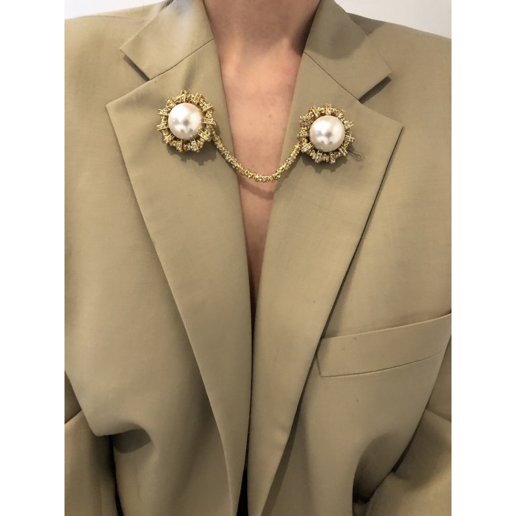 Kombinace dvou broží spojených třpytivým řetízkem, je vyrobená z postříbřených měděných korálků Rondel, zdobených třpytivými skleněnými kameny, Jedná se o všestranný šperk, který můžete kreativně umístit na jakoukoli část vašeho outfitu - zkuste spojit klopy saka, nebo rozparky na kalhotových nohavicích. Fantazii se meze nekladou.