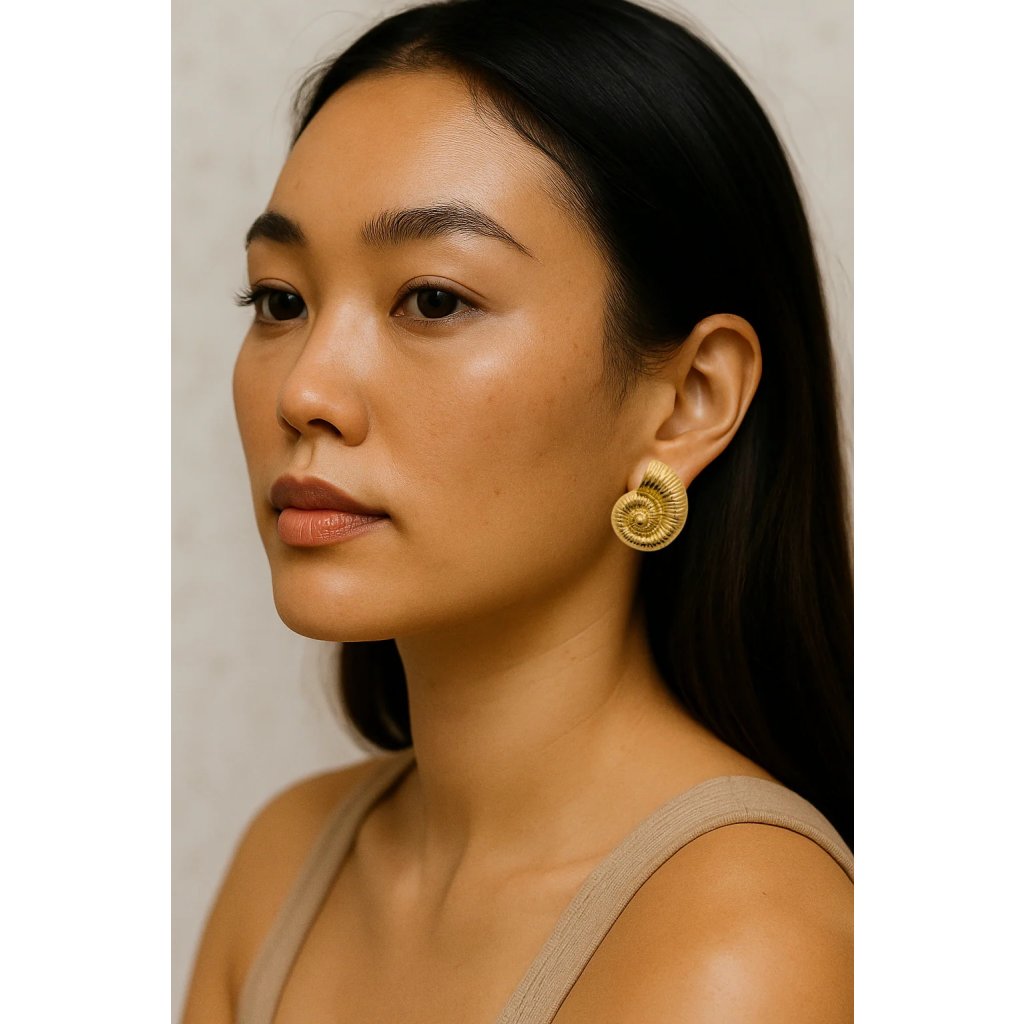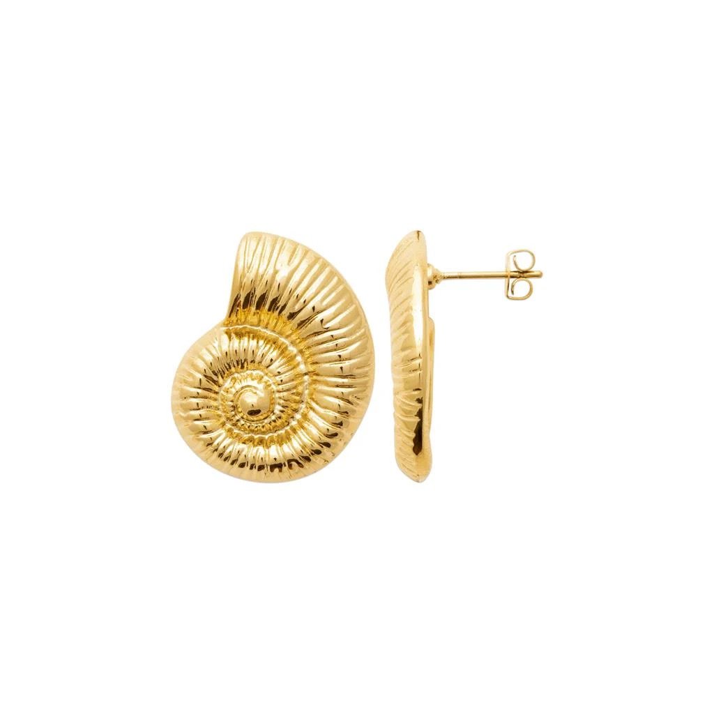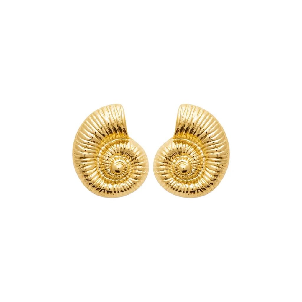 Tyto elegantní náušnice ve tvaru umělecky vytvořené lastury evokují krásu mušlí a zkamenělých amonitů. Jsou vyrobeny z robustní nerezové oceli a drahé mosazi a jsou pozlacené vysoce kvalitním 18karátovým zlatem – zlato pochází ze 100% recyklovaných zdrojů.