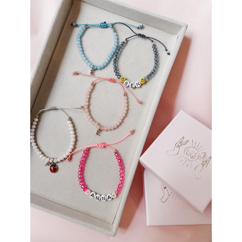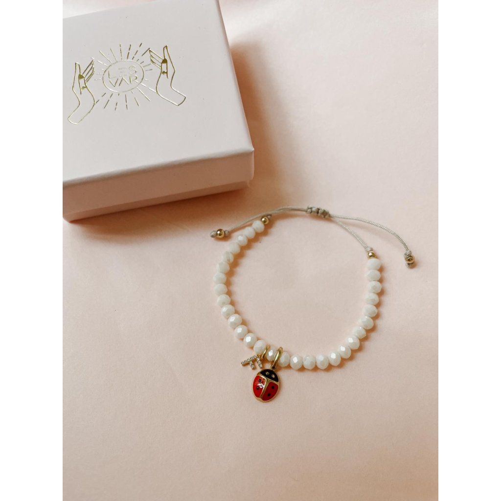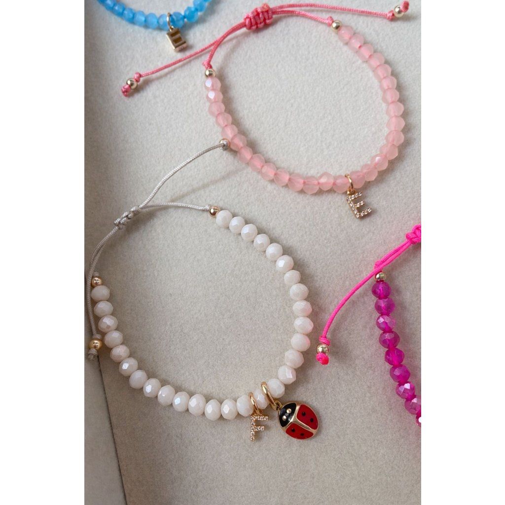 Jemný personalizovaný náramek s písmenkem a roztomilou beruškou je symbolem radosti, ochrany a štěstí. Díky možnosti volby písmenka - s kamínky be