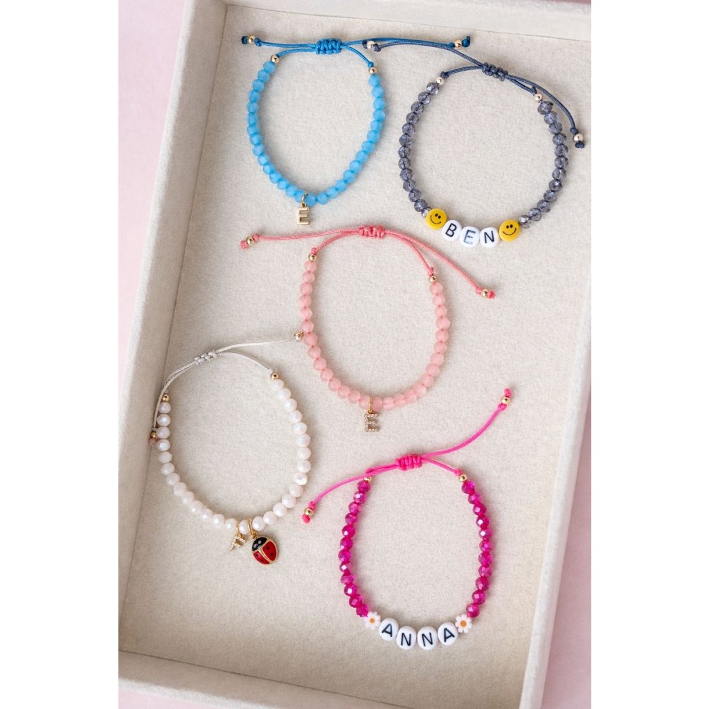 Jemné barevné skleněné korálky doplňují hravé smajlíky a písmenka se jménem, díky nimž je každý kousek naprostý originál. Lehký, pohodlný a nastavitelný - perfektně padne na každé dětské zápěstí a zvládne školku, hřiště i slavnostní chvíle.